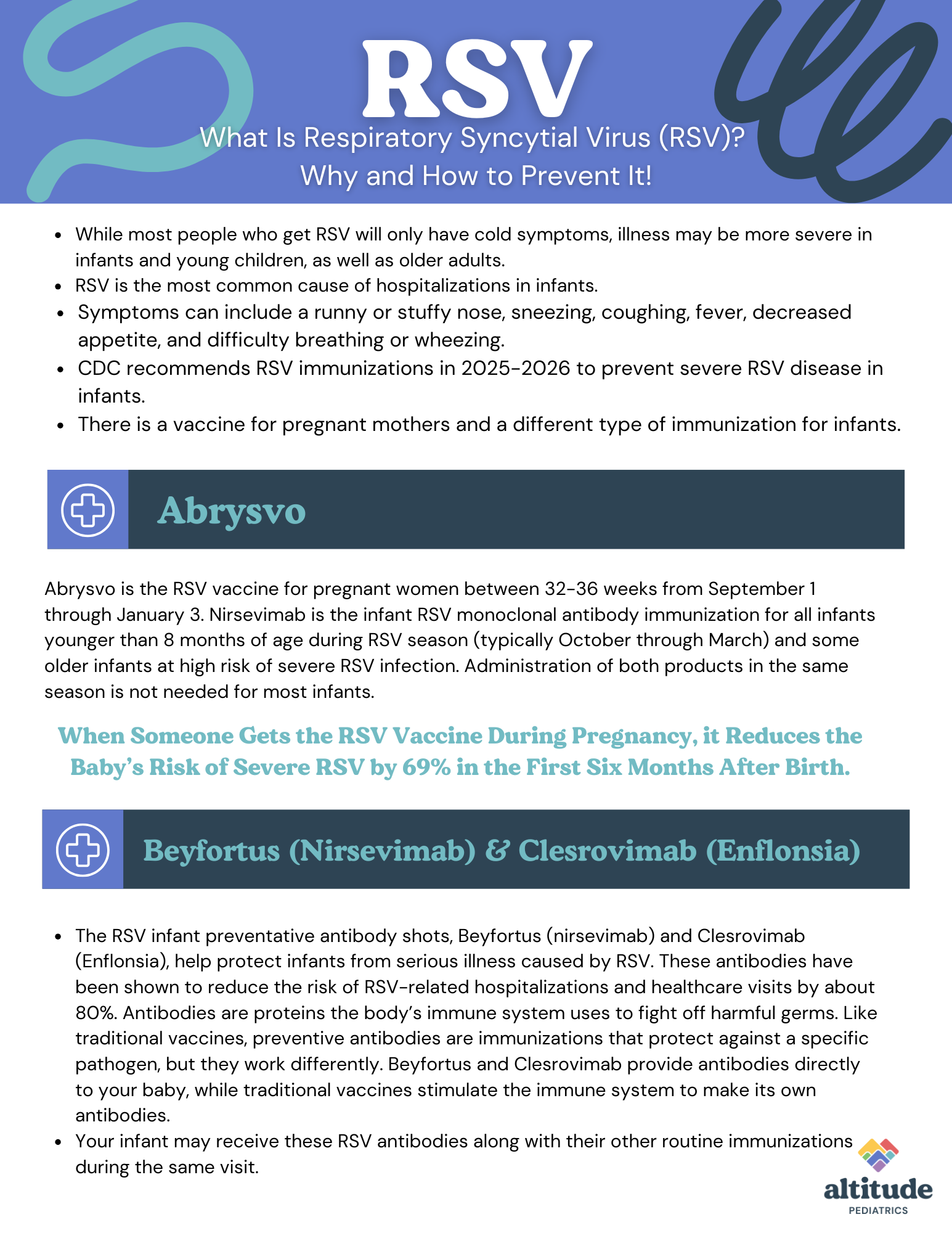 Respiratory Syncytial Virus (RSV) is a common virus that primarily affects the respiratory tract, especially in young children, older adults, and individuals with compromised immune systems. Beyfortus, a preventive antibody for RSV, will be available next week. If your baby is eligible, you will receive a text message from our office with further details.